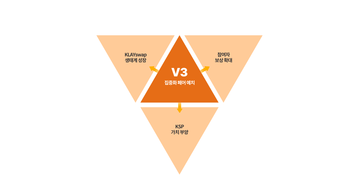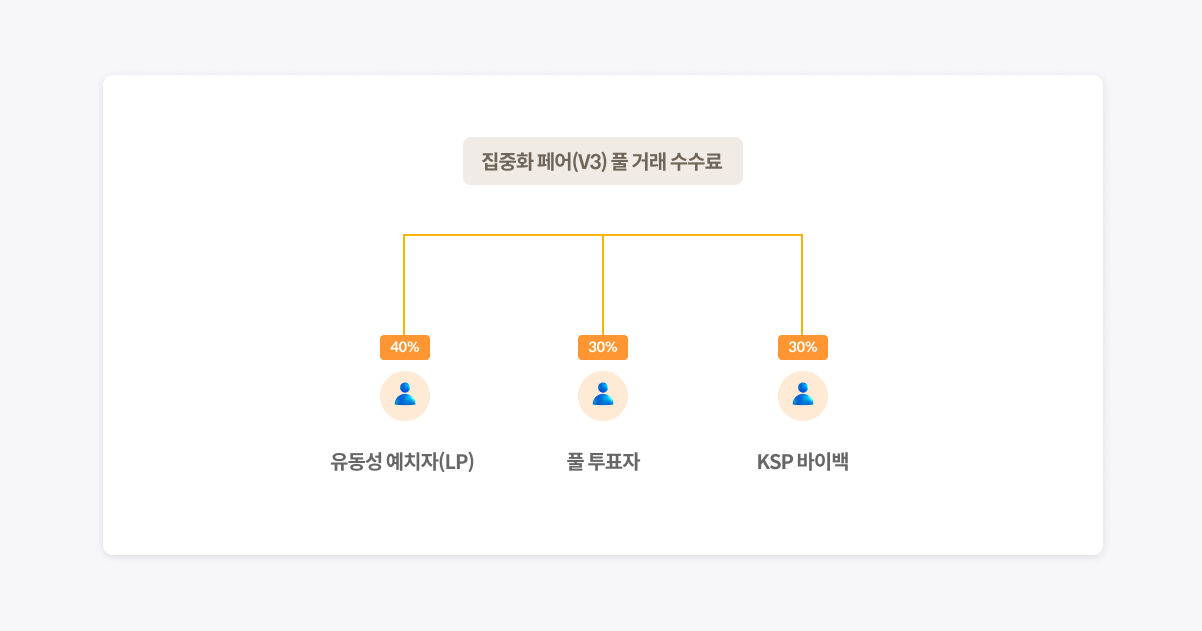 일반 페어(V2) 예치자는 풀 거래 수수료 대신 KSP 보상만 분배 받는 반면, **집중화 페어(V3) 예치자**는 **풀에서 발생한 수수료 수익의 40%를 분배** 받습니다. 집중화 페어 풀에 예치한 자산은 거래에 활발하게 활용되면서 더 많은 거래 수수료 수익을 창출합니다. 이러한 거래 수수료 수익을 분배함으로써 예치자는 유동성 공급 과정에서 발생할 수 있는 비영구적 손실에 대한 부담을 줄일 수 있습니다. 또한 KSP 분배 정책에 따라 집중화 풀에도 **KSP 보상이 분배**되며, 활발한 거래량을 바탕으로 더 많은 KSP가 분배되어 예치자가 더 확대된 보상을 획득할 수 있습니다.