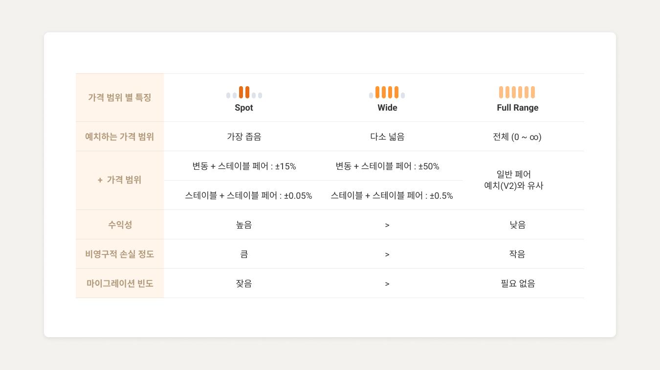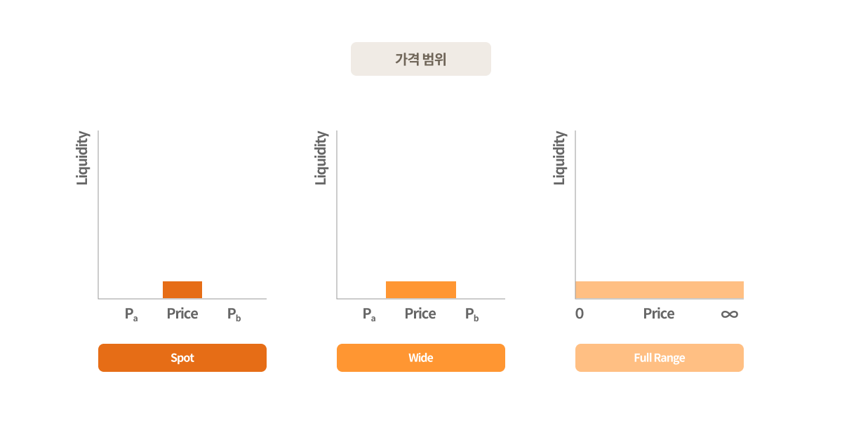 '가격 범위'란, 예치하는 자산이 거래에 활용될 최소가격과 최고가격 구간을 의미하며, 이 가격 범위 내에서 거래가 발생하면 예치자는 거래 수수료 수익을 분배받을 수 있습니다. 각 가격 범위의 특징은 다음과 같습니다.