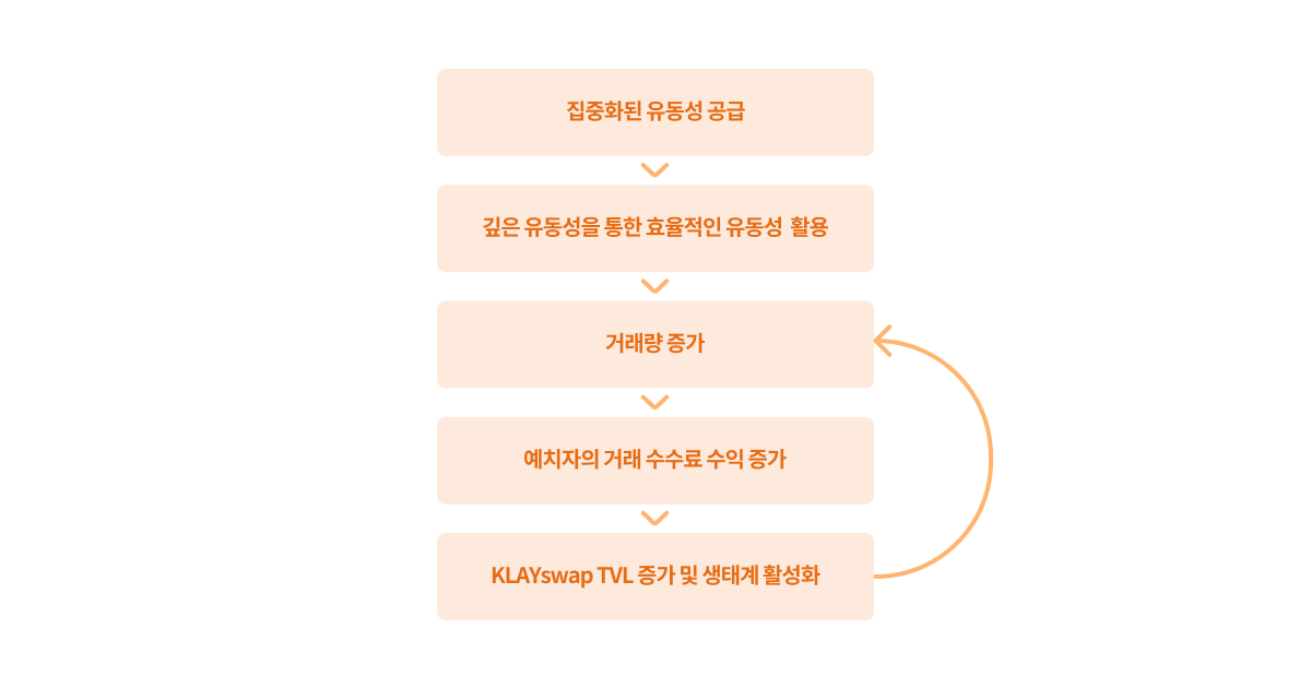 집중화 페어 예치 풀에서 발생한 거래 수수료 수익의 40%를 집중화 페어 예치자에게 분배하여 신규 유동성을 지속적으로 유입시킵니다. 이를 통해 KLAYswap은 더 풍부한 유동성을 확보하여 TVL이 증가하고, 더 풍부한 유동성을 확보하여, 상승한 TVL을 바탕으로 다시 더  많은 거래 수수료 수익을 발생시키는 선순환 구조를 구축합니다.<br>