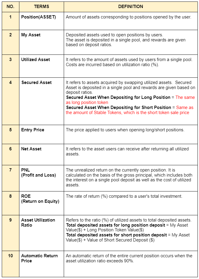 * &#x20;In case the user requests to end the position, the retained assets that have been deposited in a single pool (For long position deposits, corresponds to long position tokens; for short positions, corresponds to stable tokens obtained by selling utilized assets) must be withdrawn, and the assets that have been utilized first must be returned. If the user has returned all of the assets, the user can withdraw the remaining assets and receive them in his or her wallet.